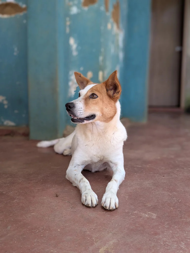 Khaleesi, a rescue dog at Dogs of Ella sanctuary, standing proudly with attentive eyes in an outdoor setting